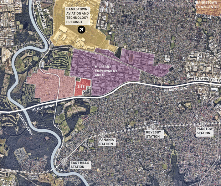 Located approximately 24 kilometres west of the Sydney CBD, the site is in Sydney's South District and is bound by the M5 motorway to the south, Ashford Avenue to the west, Bullecourt Avenue to the north, and Horsley Road to the east.