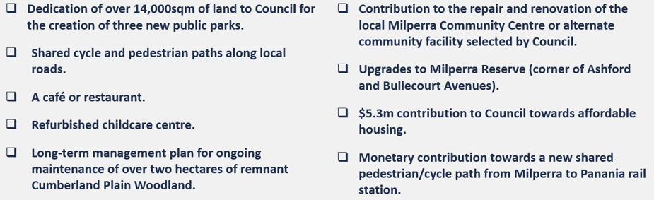 Under the Voluntary Planning Agreement (VPA) drafted in conjunction with and adopted by Council, the following community benefits will be delivered: